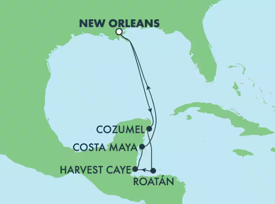 New Orleans, Louisiana, USA > Cozumel, Mexico > Roatán (Bay Islands), Honduras > Harvest Caye, Belize > Costa Maya, Mexico > New Orleans, Louisiana, USAInclusions