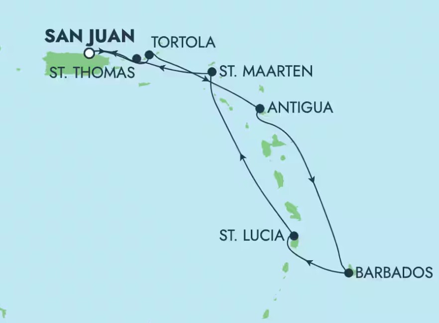San Juan, Puerto Rico > Tortola, British Virgin Islands > St. John’s, Antigua > Bridgetown, Barbados > Castries, Saint Lucia > Philipsburg, Sint Maarten > St. Thomas, U.S. Virgin Islands > San Juan, Puerto RicoInclusions