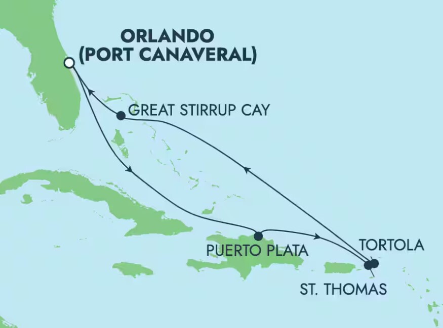 Orlando (Port Canaveral), Florida, USA > Puerto Plata, Dominican Republic > St. Thomas, U.S. Virgin Islands > Tortola, British Virgin Islands > Great Stirrup Cay, Bahamas > Orlando (Port Canaveral), Florida, USAInclusions