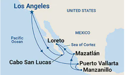 Los Angeles, California, USA > Puerto Vallarta, Mexico (overnight) > Manzanillo, Mexico > Mazatlan, Mexico > Loreto, Mexico > Cabo San Lucas, Mexico (overnight) > Los Angeles, California, USAInclusions