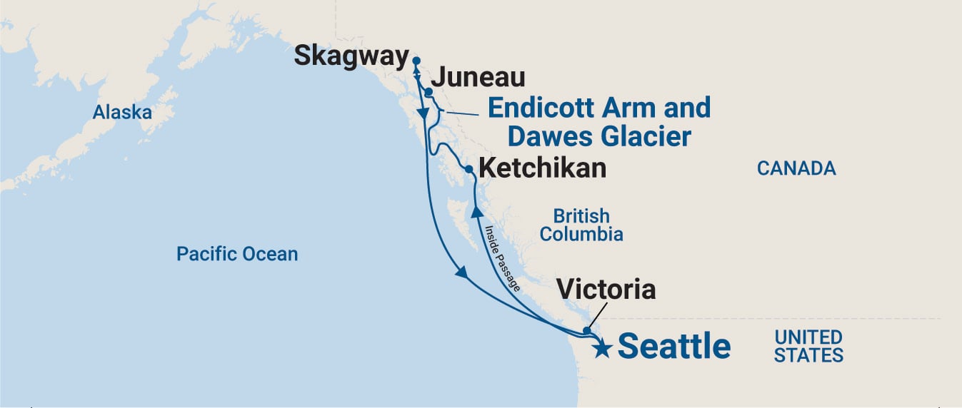 Seattle, Washington, USA > Ketchikan, Alaska, USA > Endicott Arm and Dawes Glacier, Alaska (Scenic Cruising) > Juneau, Alaska, USA > Skagway, Alaska, USA > Victoria, British Columbia, Canada > Seattle, Washington, USAInclusions