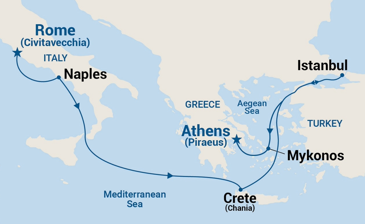 Rome (Civitavecchia), Italy > Naples, Italy (for Capri & Pompeii) > Crete (Chania), Greece > Kusadasi, Turkey (for Ephesus) > Mykonos, Greece > Athens (Piraeus), GreeceInclusions