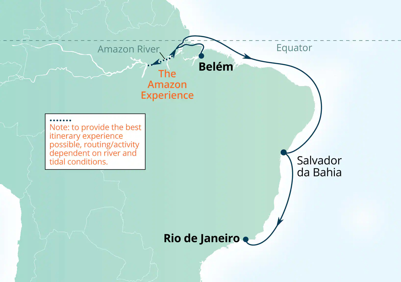 Belém, Brazil > Macapá, Brazil > Amazon Experience (2 overnights) > Macapá, Brazil > Crossing the Equator > Salvador de Bahia, Brazil > Rio de Janeiro, BrazilMore