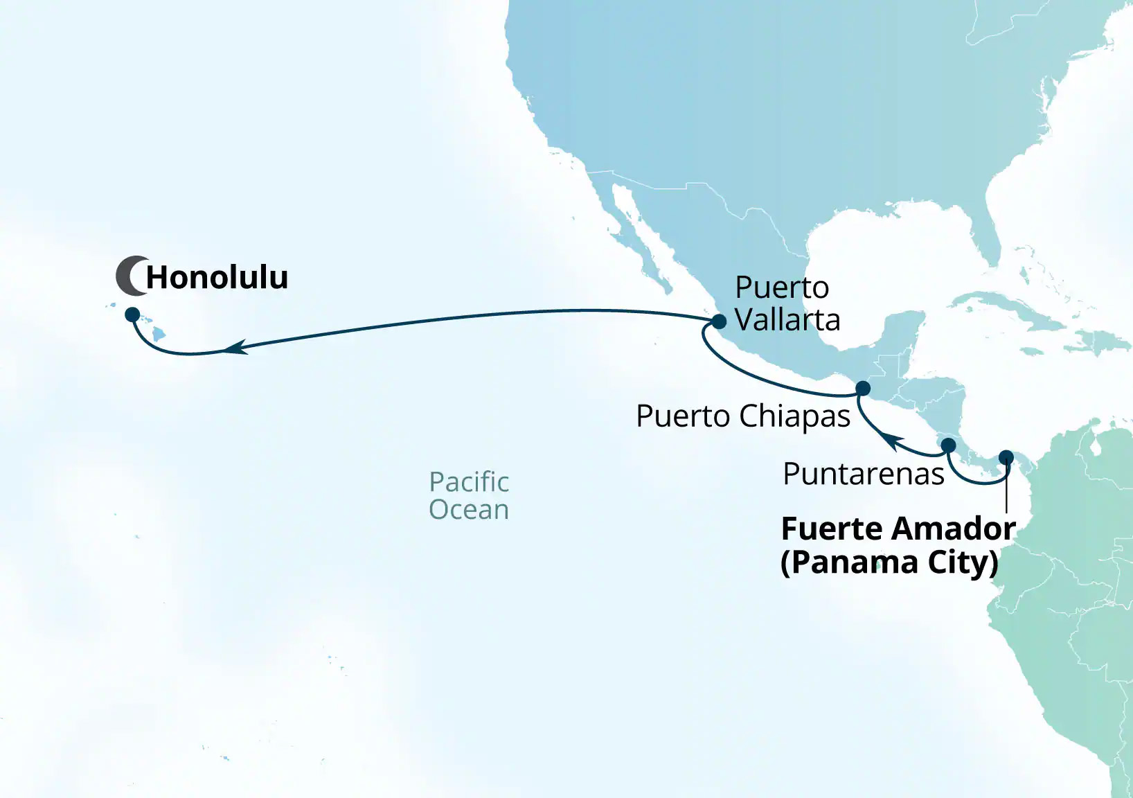 Fuerte Amador, Panama > Puntarenas (Puerto Caldera), Costa Rica > Puerto Chiapas, Mexico > Puerto Vallarta, Mexico > Honolulu, Hawaii, USA (overnight)More