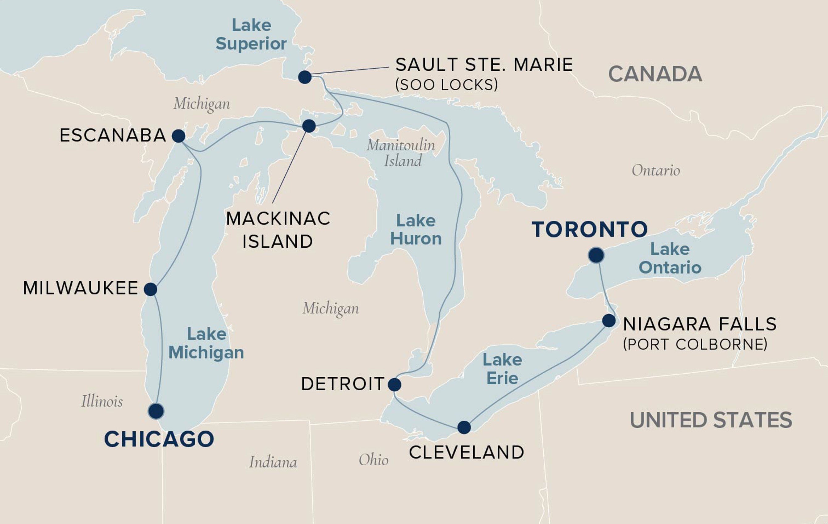 Chicago, IL, USA > Milwaukee, WI, USA > Escanaba, MI, USA > Mackinac Island, MI, USA > Sault Ste Marie, MI, USA> Detroit, MI, USA > Cleveland, OH, USA > Port Colborne, ON, Canada > Toronto, ON, CanadaInclusions